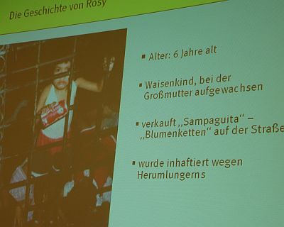 2006 wurde auf den Philippinen ein neues Gesetz verabschiedet. Es besagt, dass Kinder und Jugendliche unter 15 Jahren nicht mit Gefängnisstrafen belegt werden dürfen. Bis dahin wurden Kinder bereits ab 9 Jahren inhaftiert und in der Haft mit erwachsenen Straftätern zusammengelegt. Dadurch waren sie Misshandlungen und sexuellem Missbrauch hilflos ausgeliefert. Das Bild der kleinen Rosy erschütterte die Anwesenden zutiefst. Ein kleines 6-jähriges Mädchen mit einer Getränkedose in der Hand, klammert sich an die Gitterstäbe. Rosy ist ein Waisenkind, aufgewachsen bei der Großmutter, musste das Mädchen "Sampaguitas" (Blumenketten) verkaufen und wurde wegen "Herumlungern" eingesperrt. Genauso schlimm traf es die beiden Brüder Jhun und Boget, 11 und 12 Jahre alt. Sie waren wegen Misshandlungen von zu Hause weggelaufen und versuchten mit dem Verkauf von Bonbons und Zigaretten zu überleben. Beim Schnüffeln von Klebstoff erwischt, landeten die beiden im Gefängnis.